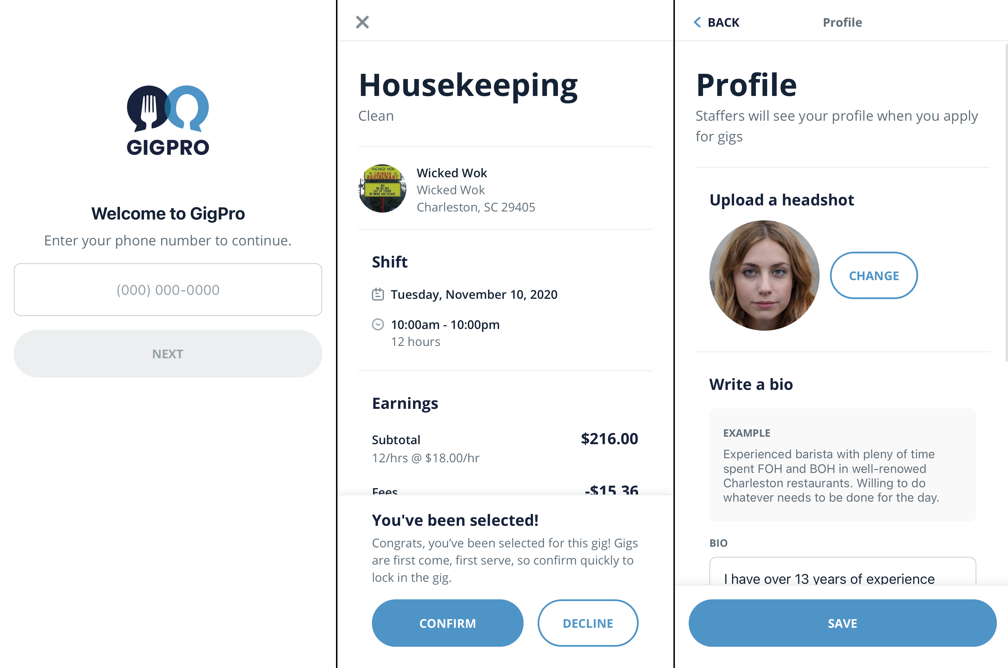 GigPro is a React Native mobile app that allows gig workers to apply for temporary jobs in the hospitality industy.